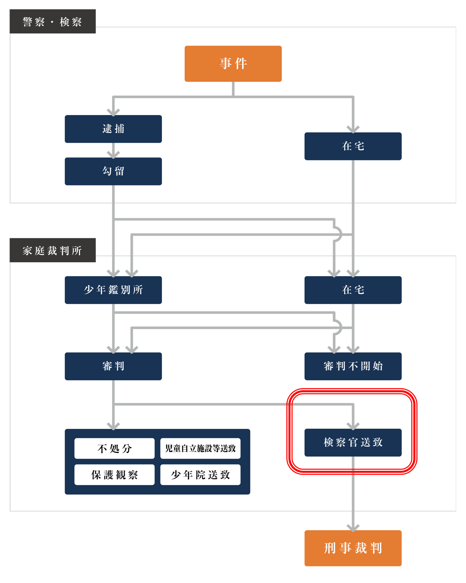 (少年院送致は、保護処分と呼ばれ、刑事処分ではありません。)しかし、手続きの途中で少年の年齢が20歳を越えた場合や、悪質な事件で刑事処分を相当とする場合には検察へ事件が送致されます(逆送)。